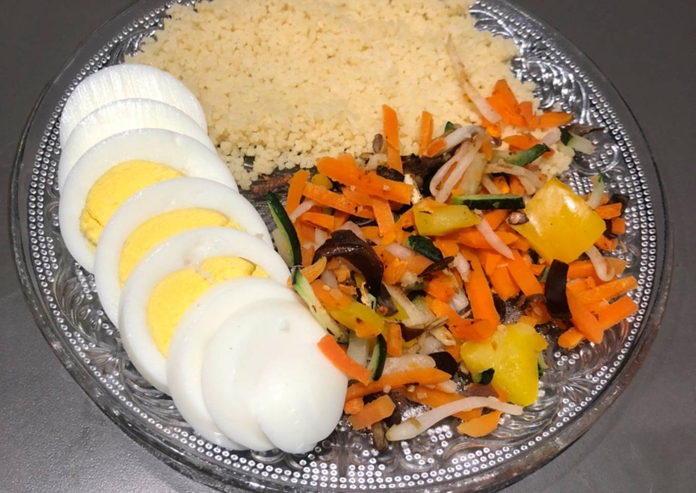 - Faire cuire la semoule (un verre d’eau bouillante pour un verre de semoule, couvrir et laisser poser 5 minutes et ajouter du beurre.)