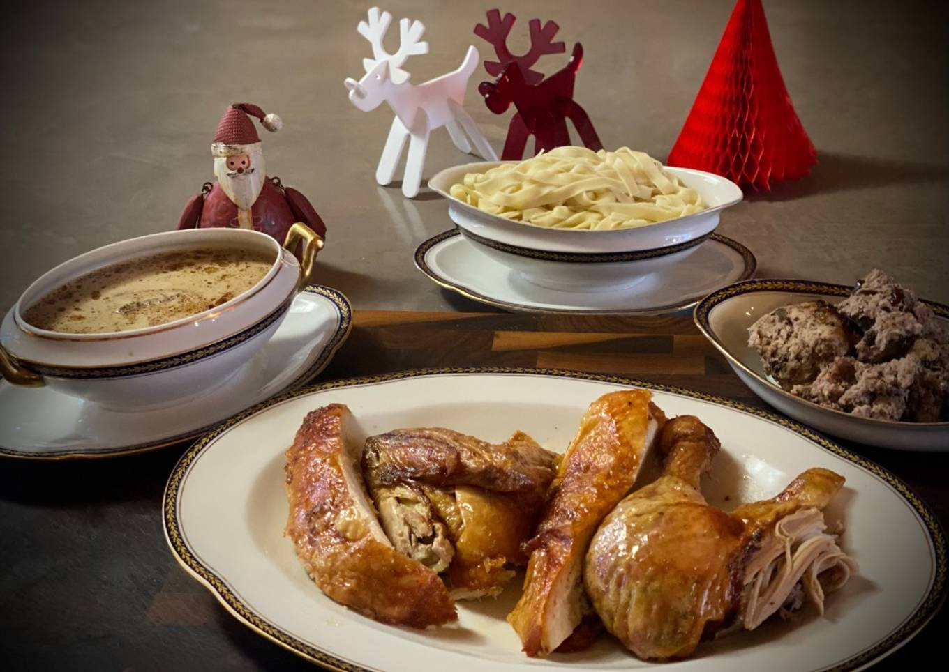 Chapon farci, pâtes fraiches, marrons, sauce aux morilles et vin jaune