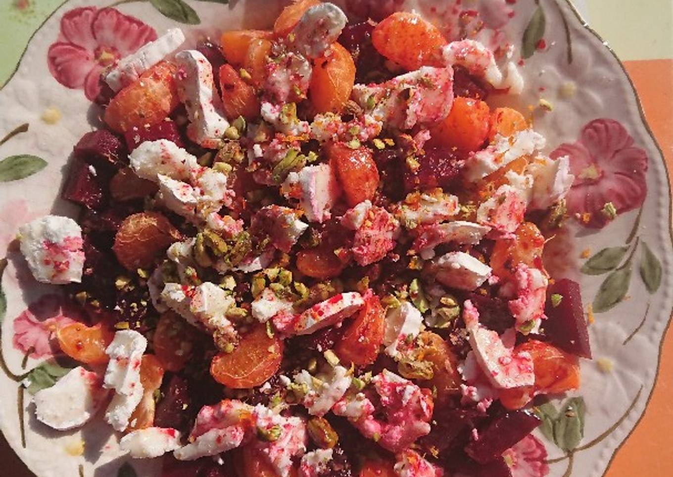 - Couper les betteraves en dés, ajouter les mandarines en quartiers (ou les oranges a vif) et le fromage aussi en petits morceaux. Ajouter les pistaches concassés et le zeste d'orange. Assaisonner avec la vinaigrette de betterave