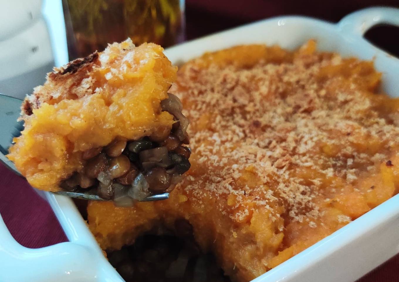 Versez les lentilles cuites dans un plat allant au four et recouvrez le tout de purée de patates douces.